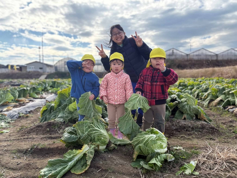 「おーきーて!」の掛け声に合わせて白菜を揺らして収穫です☆上手に出来ましたね!
